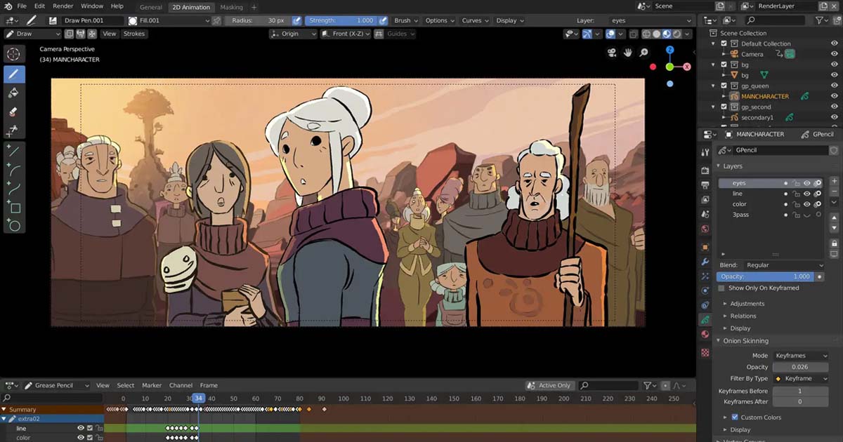With Grease Pencil and its 2D/3D hybrid capabilities, Blender is one of the most powerful professional tools for 2D animation. Its main advantage is the ability to easily integrate 2D animation with 3D effects and VFX, making it ideal for both artists and studios.